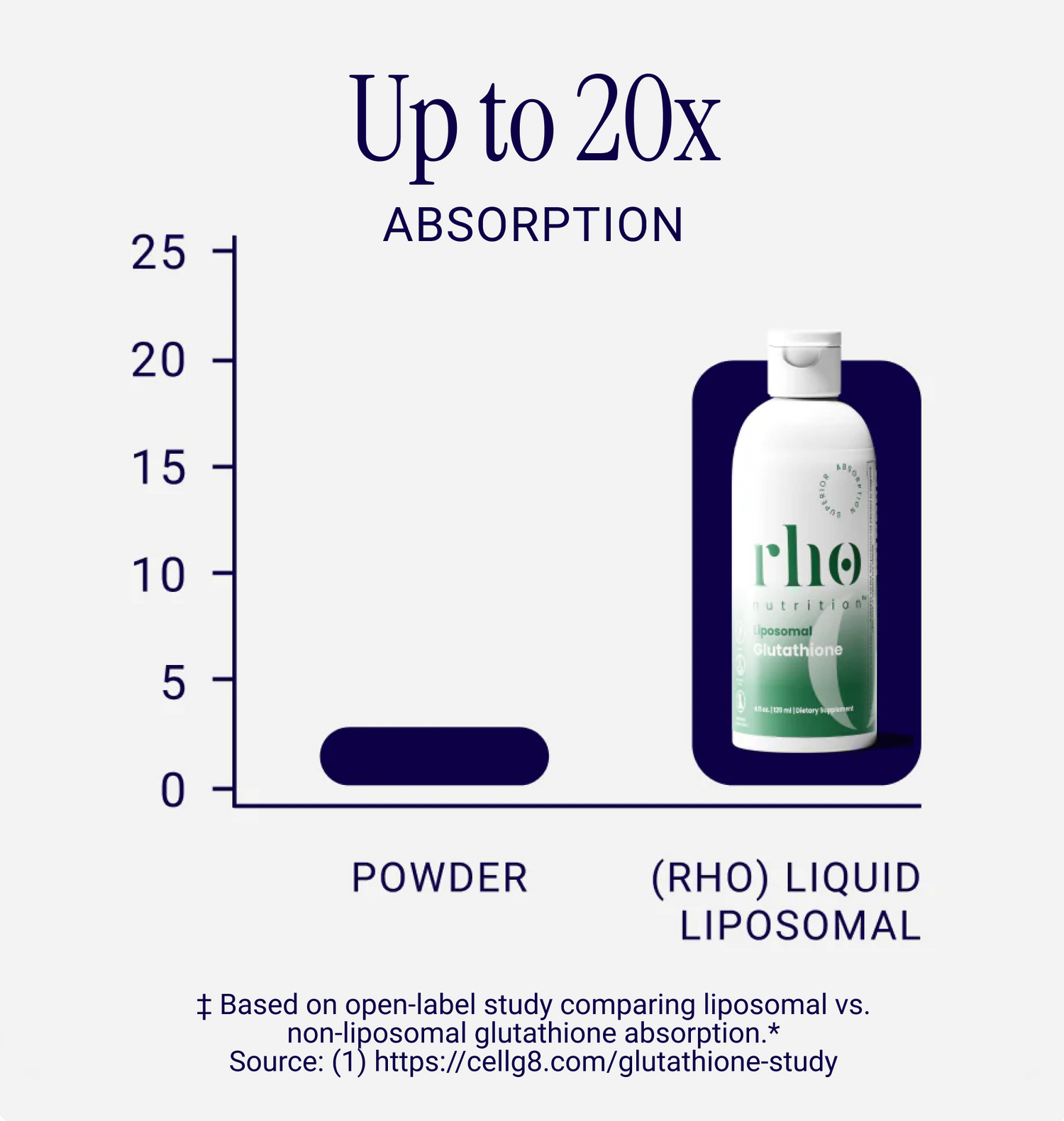 Rho's liquid liposomal glutathione has been shown in an open-label study to offer up to20x greater absorption into the bloodstreamcompared to non-liposomal powder forms, supporting more efficient nutrient delivery and availability.‡